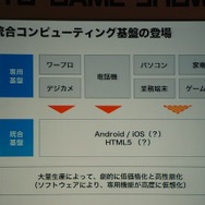 もっとも、これは過去の話。田中社長は「今後の5年間に起きる、もう一つの大変化」として、コンピュータのダウンサイジングの波を受けて、「スマートフォンを母体とした、統合コンピュータ基板が登場する」と分析。ゲーム業界も、こうしたIT業界の潮流を踏まえる必要があると語りました。