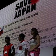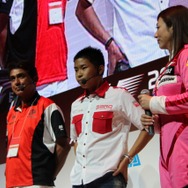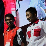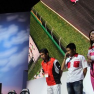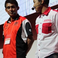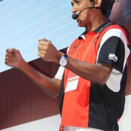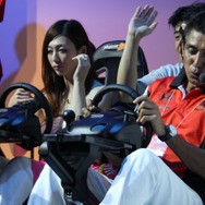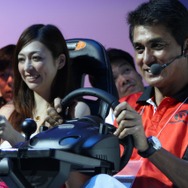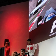 ステージの後半では亜久里氏と塚本氏が『F1 2011』を使って対戦。井口氏が今年走ったというインドネシアを使って行われましたが「本当にそっくり」(井口氏)だとのこと。レーシングシートを使って行われたこの対決。先行したのは亜久里氏でしたが、ピットインのせいもあり、結局は塚本氏の勝利。罰として亜久里氏はステージの後にコードマスターズブースで居残り練習となってしまっていました。