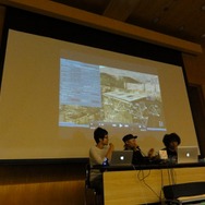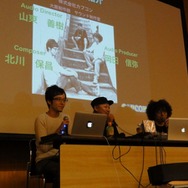 サラウンド環境のある研修室に登場したのはオーディオプロデューサーの岡田信弥氏、オーディオディレクターの山東善樹氏、コンポーザーの北川保晶氏。会場中をドッと笑わせる3人の絶妙なトークを交えながら、BGMやSE(効果音)の過程やヒミツを知ることができる貴重なイベントとなりました。