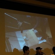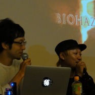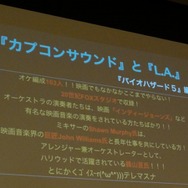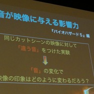まずは、音が映像に与える影響力を『バイオハザード5』を題材に実証されました。クリスとウェスカーが乱闘するシリアスな場面に流れてきたのは、『ぽかぽかアイルー村G』を想起させるようなコミカルでキュートなBGM。ただ音楽が鳴っているだけではなく、殴る、吹っ飛ぶなどのタイミングでこれまた間の抜けたSEが鳴るので思わずみんな笑ってしまいます。その後、本物のBGMとSEが当てはめられたカットシーンを見て、音によって映像の印象がどれだけ違うかを確認しました。
