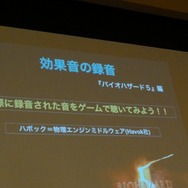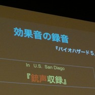 おもな効果音の収録は大阪にあるカプコンのスタジオでも行われています。木箱を落として割ってみたり。さらにその収録されたものは、実際にプレイヤーが操作した状況に合わせて鳴らないといけないので、物理演算ソフトをつかって落下(大・中・小)、引きずり、壊れといったパターンをいくつも用意しているそうです。敵であるクリーチャーについては、映画などの効果音を手がけているハリウッドのサウンドデラックス社との共同制作。クリーチャーが歩くタイミングに合わせて、お皿に盛られたピーナッツをお面でゴリッ、グチャッと潰している姿が印象的です。
