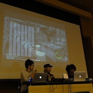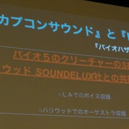 その後は、映像に合わせたBGMが実際にどう作られるのかということで北川氏がリアルタイムで制作を行いました。題材はカプコンのソフトを起動すると見られる、ニンテンドー3DS用のCAPCOMのロゴムービ。北川氏は音楽ソフト“CUBASE”を起動。ロゴムービーを見ながら「水々しい感じがする」「コロコロした感じがありますね」「もうちょっと迫力がほしい」「ショワーンと飛び出している」「トゥーンと飛んでく感じも欲しい」と感覚でつかんだイメージを元にストックされている音色を探し、音を重ねていきます。