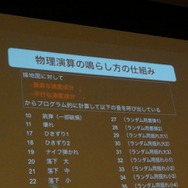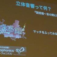 ニンテンドー3DS向けに発売された『謎惑館~音の間に間に~』のサウンドを担当したのは岡田氏。3DSが立体視になっているため、音も立体にという試みで立体音響を採用。実際に会場で聞いてみると、遠くで鳴っている音が近づいてくる、自分の周囲をハチがグルグルと回っているといったような、音の位置が耳で判断がつきます。この立体音響をより楽しむために、岡田氏は是非ヘッドフォンでゲームをプレイして欲しいと語っていました。