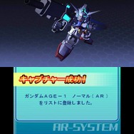 ARカードを3DSのカメラで認識させれば、さまざまなポーズを取らせたり、ユニットとして生産できるよう、ゲーム内に登録されます。もう片面を使えば、現在稼動中の進化系カードゲーム『ガンダムトライエイジ』でガンダムAGE-1 ノーマルを使用できます。