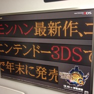 先日、出張で大阪に行った際、新幹線に乗ったらありました、ニンテンドー3DSで発売される『モンスターハンター3(トライ)G』の広告です。新幹線車内のニュースが表示されるディスプレイを模したクリエイティブの広告で「モンハン最新作、ニンテンドー3DSで年末に発売」と書かれています。なかなか凝った作りでインパクトがありそうです。12月10日の発売まであと1ヶ月、盛り上がってきましたね。