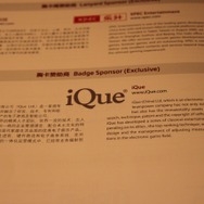 パンフレットの中のスポンサー紹介では「iQueは優れた人材、技術によって幾つもの良く知られるエンターテイメント製品を生み出し、中国のゲーム市場に合わせて提供しています」と書かれています。任天堂という文字は一言も書かれておらず、英語も何となくおかしいのが気になりますが、まあこんなものでしょう。