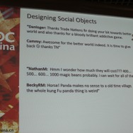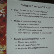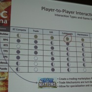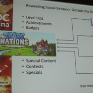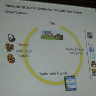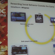 続いては『TradeNation』『MetaStorm: Wingman』という2つの実際のゲームを紐解きながらソーシャル要素の導入について語られました。『TradeNation』ではユーザーの様々な行動がフェイスブックなどを通じてフィードされます。ゲームからも容易に共有が出来る仕掛けが施されています。また、『TradeNation』は物々交換がゲームのキモであり、最初からソーシャルなゲームという見方もできます。『MetaStorm: Wingman』も友達のパイロットランクを使って一緒に空に飛び立つという遊びであり、ソーシャルが前提の作りになっています。ゲームの内側と外側、両方のソーシャル性が大事ということです。