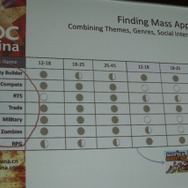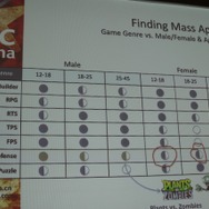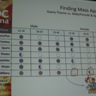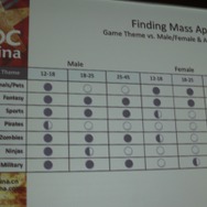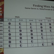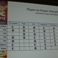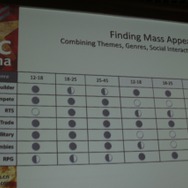 まず議論されたのはジャンルの向き不向きです。モバイルゲームで人気なジャンルには「街づくり」「RPG」「RTS」「TPS」「FPS」「タワーディフェンス」「パズル」などがありますが、それぞれそのジャンルが上手く受け入れられる世代というものがあります。また、ゲームのテーマ、「スポーツ」「ゾンビ」「ニンジャ」「海賊」などにも上手く合う世代が存在します。また、ゲームのジャンルによって、上手く適合するユーザー間のインタラクションの方法もあります。Bluhm氏はこれらをマトリクスで紹介。独自調査ですが参考になりそうです。