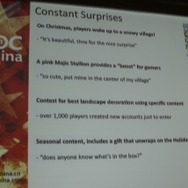 Bluhm氏はまた、モバイルゲームにおいては継続的なアップデートを通じて、常に新鮮な驚きを与えることが何よりも重要と語りました。アイテムの追加、コンテストなどのイベント、ハロウィンやクリスマスなどのデコレーションなどです。こうした地道なアップデートがユーザーを定着させ、人気を高める秘訣と言います。