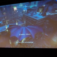 続いてスクリーンの大画面(約220インチ)で実際にゲームをプレイ。バットマンと言えば空を飛んでの移動ですが、「ゲーム中は画面上に表示されている「!マーク」の方に進むと物語が進むので迷うことはありません」と椿姫さん。地上ではごろつきなどの悪がいるので、戦って倒していきます。また、敵とのバトルも簡単操作となっており、「△がカウンターボタンなので、基本的これ押していればいろいろコンボ出せたりして、華やかにバットマンを操作できる」と有村が解説します。状況に応じて音楽が変化するので、まるで映画の世界観そのものですね。