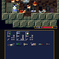 可愛らしいドット絵もステキな本作ですが、アクションパートを基本上画面のみに集中したインターフェイスがとてもイイ感じです。というのも、このゲームのアクションは、敵の動きやトラップなど「画面をよく見て判断すること」を必要とする場面・局面が連続していくタイプなので、出来るだけ下画面に目線をやりたくないわけです。下画面が活かされるのは、主にアクションのパートが止まるシーン。「会話」の文字や、スタートボタンを押したときの「アイテム選択」、セレクトボタンを押したときの「マップ」など。これらのときはゆっくりと下画面に目線をやれるので、上画面の状況を確かめながらゲームを進行することができます。