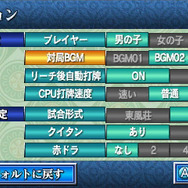 本作では通常のルールのほか、よりいっそう気軽に麻雀を楽しめるように、プレイヤーが一部のルールと設定が変更できるようになっています。ゲームを彩るBGM、通勤や通学の短時間でも対局を終えることができる「東風戦モード」、じっくり打牌を考えたい人、早打ちをしたい人のためのCPUの打牌速度調整など、初級者から上級者に対応した細かな設定が可能です。