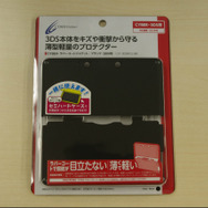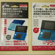 「CYBER・本体&液晶保護フィルムセット」は上下画面の液晶周囲だけでなく、本体天板、底面用の2枚を加え、3DSの全ての箇所を保護するシートとなっています。画面周囲は「CYBER・液晶保護フィルムPremium」と同じ3層構造ですが、天板と底面用は指紋防止+ハードコート層、透明PET層というように場所によって適した素材が選択されています。これがあれば全方位が安全になります。参考価格1580円(税込)です。