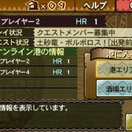 そして本作には、「ハンターサーチ」と呼ばれる新機能が登場。3DSの無線通信を使って、近くで『MH3(トライ)G』をプレイしている人を検索できる機能です。ハンターサーチのパネルをタッチすれば、自分のまわりの人がどんな状態なのかが一目瞭然。検索したプレイヤーがオンラインならば、そのプレイヤーのオンライン港へ直接移動することもできます。