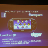 2日後の12月17日に発売されるPSVitaについても紹介。最先端の携帯ゲーム機としての体験を実現するだけのものではなく、ネットワークを統合した今までにないマシンと説明。様々なネットサービスとの連携も図られます。具体的には、ツイッター、フェイスブック、forsquare、Skype、Flickrに対応したアプリをStoreで配信していくとのこと。17日にはツイッターアプリをリリースし、その後も年明けから順次広げていくとのこと。