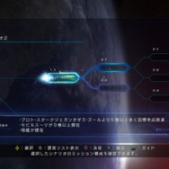 各キャラ横の黄色いアイコンは、そのキャラクターによる戦闘以外の原作シナリオ部分のモノローグになりストーリーを補完します。各キャラクターのモノローグは原作アニメカットを背景にフルボイスでキャラクターたちの心情が描かれ、本編とは違った角度で原作の物語を追っていくことができます。青いアイコンはミッション部分になり、機体を操り原作のミッションをクリアしていきます。クリア後には特典も用意されているようです。