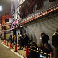 今度は反対エリアの東口についてです。駅からも近い、ヨドバシカメラ新宿東口では同時間帯で12名前後の人たちが列をなしていました。列は表通りに繋がる通路の方まで伸びつつある状況となっていました。