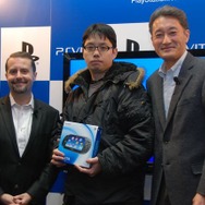 会場ではSCEI代表取締役社長兼グループCEOのアンドリュー・ハウス氏と、SCEI代表取締役会長の平井一生氏も駆けつけ、寒風の中で店頭に並んだ約130名のユーザーと共にカウントダウンを実行し、発売日を祝いました。購入第一号のユーザーは「寒いのと、眠いのと、緊張しているのとで、頭が真っ白です」とコメントし、ハウス氏・アンドリュー氏と共に報道陣のフラッシュを浴びていました。