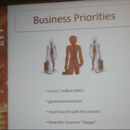 ビジネス面から立案されたゴールは「月間アクティブユーザー100万人」「マネタイズの成功」「映画と同時のリリース」「ライセンサーを満足させる」といったものでした。