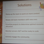 このようにユーザー獲得やマネタイズの面では成功を収めた『The Smurfs & Co』でしたが、課題となったのはリリース後のアップデートです。元々あまりそこに注力する計画ではなかったため、ユーザーの動きを見ながら拡充が図られましたが、継続的なアップデートにチームは疲弊。これに対応してメンバーの入れ替えも行い、チームは総勢33名という規模に。当初の開発期間が4ヶ月という短期だったこともリリース後の準備が不十分だった要因だったとのことで、次回以降は配慮が必要ではないかとしていました。