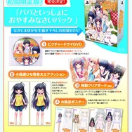また、通常版だけでなく初回限定版「パパといっしょにおやすみなさい!パック」も発売決定。イラスト担当のなかじまゆか先生描き下ろしの特製BOXに、「ピクチャードラマDVD」「小鳥遊ひな等身大エアクッション(全長90cm)」「特製クリアボード4枚セット」「お風呂ポスター4枚セット」が収録された豪華版となっています。