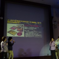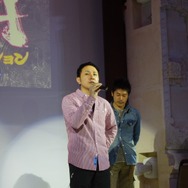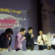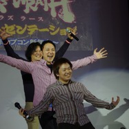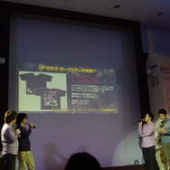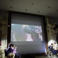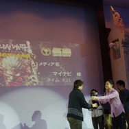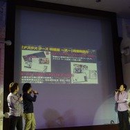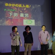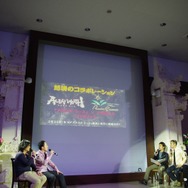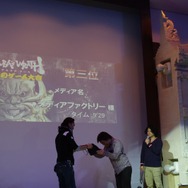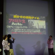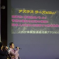後半はサイバーコネクトツーの下田星児ディレクターもステージに登場。来場者の中から10人募い、第9話のクリアタイムを競うゲーム大会が行われ、その様子を解説。上位3名には『アスラズ ラース』ゲームソフトやグッズがプレゼントされました。プレイ映像はスクリーンに表示され、大会に参加しない人はここで最新のゲーム映像などを見ることが出来ました。