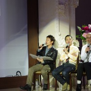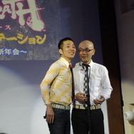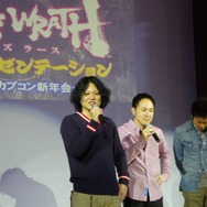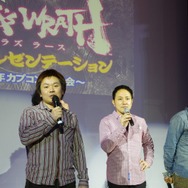 ステージには、カプコンパブリシティ企画推進室 室長の萩原良輔氏、カプコン『アスラズ ラース』プロデューサーの土屋和弘氏、そして開発を担当するサイバーコネクトツー松山洋氏の3人が登壇。『アスラズ ラース』の最新情報と新年のあいさつを行いました。