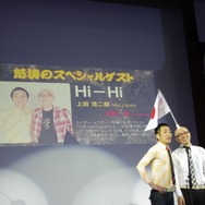 新年会と言うことで、スペシャルゲストとしてお笑いコンビのHi-Hi(上田浩二郎さん、岩崎一則さん)が登場。吸盤付き日の丸旗を頭に向かって投げて乗せたり、北斗の拳や万引きGメンなど、持前のネタを披露して来場者を楽しませてくれました。