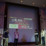 続いて『アスラズ ラース』プレゼンテーションは、カプコン土屋プロデューサーとCC2松山社長を中心に、萩原氏とHi-Hiの2人を含む5人で進行。現在配信中の体験版(5話と11話が遊べる)を実際にプレイしながら改めて『アスラズ ラース』について紹介していきます。