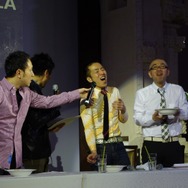 「『アスラズ ラース』は足掛け3年程開発してきました。いよいよ完成しました。これまでゲームを紹介するのは土屋さんと松山社長の2人が多かったのですが、今回3人揃ったので『アスラズ ラース』のポーズをやらせていただきます!」(下田ディレクター)