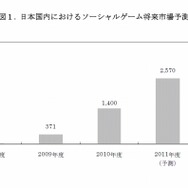 それによると、2008年度に49億円だった国内ソーシャルゲームの市場規模は、その後も急成長を続けており、2011年度は前年度比1.8倍の2,570億円、2012年度は同1.3倍の3,429億円に拡大すると予測されました。