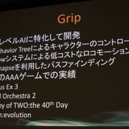 「GRIP」ではそうした高度で生き生きしたキャラクターの知能をノードベース(ビヘイビアーツリー)のスクリプトで実現することができます。アイドスが開発した『DeusEX 3』ではボスキャラクターの行動をGRIPで制御、Tripwire Interactiveの『レッドオーケストラ2』では16台のタンクが相互作用で戦う様子が実現されました。EAモントリオールの『Army of Two 40day』もGRIPを採用しています。