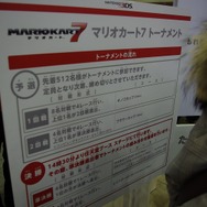 今回の任天堂ブースでは、『マリオカート7』トーナメントを開催。これは512人で行われるというもの。1回戦を8人でレースし、上位1名のみ2回戦に進出。2回戦では勝ち進んだ4人とCPU4人含む8人でレースし、上位1位が準決勝へコマを進めることが出来ます。