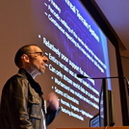 下田に続いて、エピック・ゲームズ本社のシニア・エンバイロメント・アーティスト、Mikey Spanoが登壇。ギアーズ・オブ・ウォー3のレベルデザイン・プロセスについて話しました。日本における一般的なゲームデザイン手法と異なり、初期段階でのトライ&エラーを重視したギアーズチームにおけるレベルデザインの考え方は、聴講者の大きな関心を集めました。