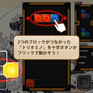 フィールドの上部から一定の速度で落下してくる3個の「ブロック」の集合体「トリオミノ」を操作して、フィールドに積み上げていきます。同じ色のブロックを横一列に揃えると「ラインスパーク」が起こり、連鎖して高得点がでたり、様々なボーナスを獲得できます。