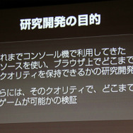 日本のPCゲーム市場は大きいものではありませんが、mixiアプリやアメーバピグなどブラウザであればゲームを遊ぶというユーザーが確実に増加しています。ブラウザゲームは日本ではライト、カジュアルというイメージですが、海外ではUnityやNative Clientなど家庭用ゲーム機並のクオリティを実現するものが増えています。研究開発はブラウザでのゲーム人口の拡大を睨んだものとなります。また、スクウェア・エニックスの強みであるグラフィッククオリティをどこまで再現できるかに主眼が置かれています。