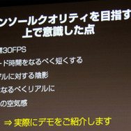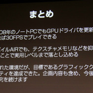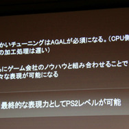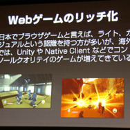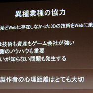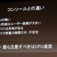 しかしこうした工夫さえすれば「プレイステーション2レベルのグラフィッククオリティは実現可能」(尾野氏)だとのこと。ただし、家庭用ゲーム機と比べるとPCはCPUが弱く、GPU性能はユーザー毎の差異が大きく、ディスク(クラウド)は無限だが接続は不安定・・・といったブラウザならではの難しいポイントがあり、中でもCPUの処理性能には配慮する必要があるということでした。