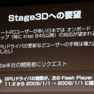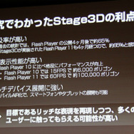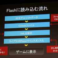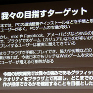 ブラウザでのゲーム開発は何もFlashに限定されるものではありません。しかし月岡氏はFlashを選択した理由について、圧倒的な普及という要因を挙げました。同氏によれば、過去のFlash Playerのアップデートでは公開から4ヶ月で約65%の国内ユーザーがそれに対応したということです。Stage3Dに対応したFlash Player 11も既に4ヶ月が経過しているため、これに当てはめれば約65%のブラウザが既に対応していることになります。