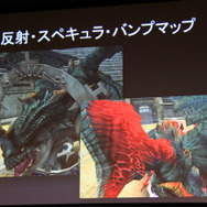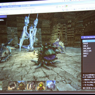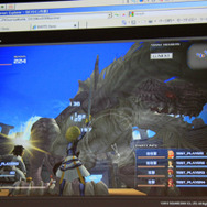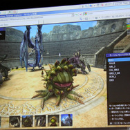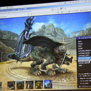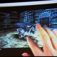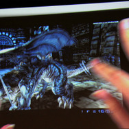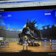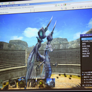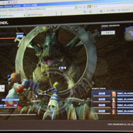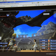 デモでは『FF12』のリングドラゴン、モルボル、キングベヒーモス、『FFCC』のトンベリやバハムートといったキャラクターが滑らかに動く様子が確認できました。リングドラゴンのリング部分には環境マッピングによりステージの絵が映りこみ、ドロップシャドウにより単純な丸影ではないリッチな表現が実現しています。モーションも滑らかです。ステージは『FF12』の闘技場のマップのモデルをそのまま使用。5万ポリゴン以上が使用されています。