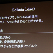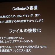 問題となったのはファイル形式です。多くの3Dライブラリで中間形式として利用されているColladaの問題点として、様々なライブラリで利用されていることから方言がある(解釈の違いが生まれる)点やXML形式なことから容量的に不利である点、テクスチャなど複数ファイルで扱うため煩雑になる点を指摘しました。容量が大きければダウンロードに時間を要し、複数ファイルになればそれだけロード時間も必要になってしまいます。