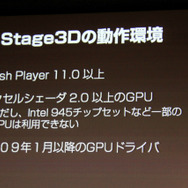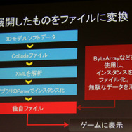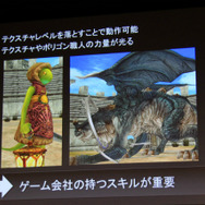 Stage3Dはモバイル機器にも対応しています。今回のデモのレベルの内容はテクスチャのレベルを落とせばモバイルでも動作可能だとのこと。尾野氏は「見た目を損なわずポリゴンやテクスチャを落とすゲーム会社の職人の力量は凄い」とコメント。ゲーム会社の持つスキルが必要になってくると指摘しました。
