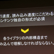 尾野氏は「実行速度や速度にこだわるならコンテンツ独自の形式が必須ではないか」と述べていました。