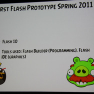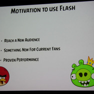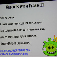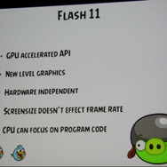 Rovioでは都度プラットフォームに最適な開発環境を選択しているということで、FacebookではFlashが選択されました。しかし当初はパフォーマンスに苦労したそうです。Rovioとしては60fpsを実現したいと考えていたものの、当初は30fpsしか出せなかったそうです。それがFlash 11が登場して一変。60fpsが簡単に実現できたほか、様々な画面サイズへの対応が容易になり、グラフィックも綺麗に。爆発時のパーティクルも5倍になったそうです。FacebookとのSNS連携も容易に実現できたとのこと。