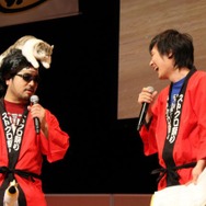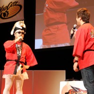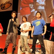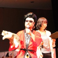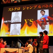 そこで、JOYさんによる「先生!」の掛け声により「Team Mad Catz」のマゴ氏、ときど氏が登場。結果は、マゴ氏&ときど氏の圧勝となりました。そのため原田氏と小野氏は罰ゲームとして「Missストクロ」の4名から強烈な蹴りを受けることに。予想以上に勢いのあるキックに両氏は思わず舞台から降りてしまいましたが、どこか嬉しそうです。