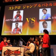 「初めて買ったスーパーファミコンソフトは『ストII』でした!」というJOYさんですが、実際の腕前はどうなのか見てみたいという原田氏と小野氏の希望により、両氏とJOYさん&Miss春麗の粕谷さんといった4名によるジャンブルバトルがスタート。自信を見せていたJOYさんですが、原田氏と小野氏による全く容赦のない攻撃にあっという間に敗退してしまいます。