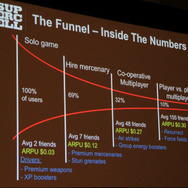 Paananen氏はここで友達の数と平均課金額という興味深いデータを示しました。友達が2人程度でほぼソロプレイをやっているユーザーの課金額は0.03ドルなのに対して、155人の友だちがおりPvPを楽しんでいるようなユーザー(全体の10%)の課金額は10倍の0.3ドルになるということです。少なくともこのゲームに限って言えば、コアゲーマーの方がお金を払うということになります。
