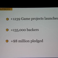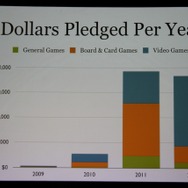 登壇したKickstarterのCindy Au氏によれば、Kickstarterでのゲーム関連のプロジェクトは大きく拡大していて、これまでに1200以上のプロジェクトが登録され、資金を出したのは13万人以上。金額にして800万ドル以上が集まりました。毎年急激な伸びがあり、2010年には約50万ドルだったのが、2011年には380万ドル、2012年は前述のDouble Fineもあり、既に360万ドルと前年を遥かに超える勢いです。
