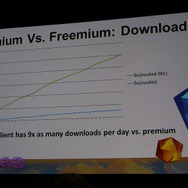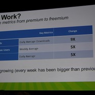 フリーミアムとプレミアム(0.99ドル)の2つを提供して分かったのはフリーミアムモデルの圧倒的な収益性です。ダウンロード本数はフリーミアムが1000万回、プレミアムが100万回と10倍の差があり(有料で100万というのはそれ自体は凄い数字ではありますが)、アクティブユーザーは週平均で5倍、さらに売上も5倍だそうです。この数字は現在でも伸びつつあるとのこと。