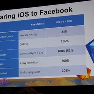 また、iPhoneとFacebookを比べると、iPhoneの圧倒的なパワーが浮き彫りになります。アクティブユーザーはFacebookが3倍あるのに対して、ARPUはiPhoneの方が3倍もあり、1日のプレイ回数も2倍です(平均で52回遊ぶ)。7日後の継続率も2倍で、課金ユーザーの率も2倍です。