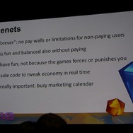Contestabile氏は課金に当たって重要なポイントは楽しませることだと言います。「Pay Now!」(今すぐ課金を)というように、課金しないことで遊びの幅を狭めたり、課金を強いることは決してプラスにならないと指摘します。「お金を払わなくても長く遊べ、かつ、お金を払うことでもっと楽しい状態を作り出すのが大事です。面白いゲームは長く遊んでもらえます。長く滞在してもらえます。結局はそれがお金に変わるのです」